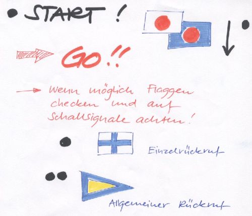 Ist man dann auf dem Kurs unterwegs, können weitere Signale gegeben werden. Darum unbedingt auch während der Wettfahrt auf Schallsignale und Flaggen achten.
