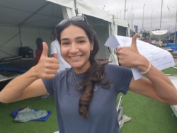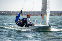 Mo 12.2. Heute spielte der Wind mit Seebrise wieder mit. Start nach Programm. 2 Rennen back to back. Im ersten Lauf bei 3-4Bft. kamen Venhoda/S. Zaugg (SUI) sehr gut zurecht, als Erste um die Luvtonnee und als 4. ins Ziel, Mermod/Hernandez (SUI/FRA) als 11. Mona Venhoda segelt vorübergehend mit Jakub Napravnik (35.). M. Erne/Poulson wurden 45. Der Sieg ging an die junge Australierin Jalina Thompson-Kambas mit Nathan Stockley am Draht.