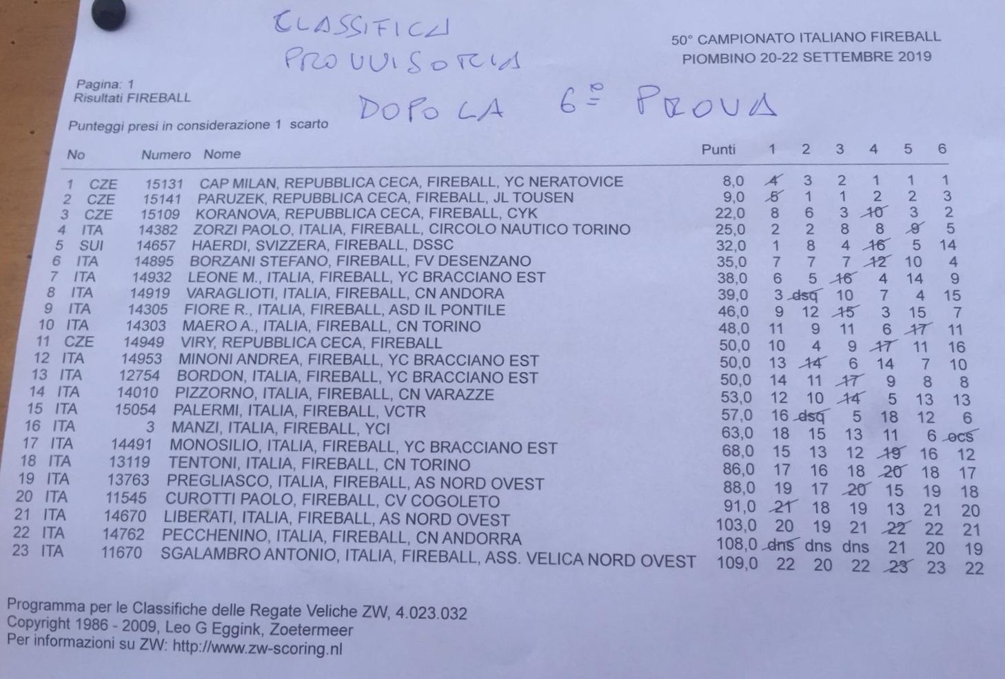 Campionato Italiano, Marina Salivoli/Piombino/ITA20. - 22. September1 SUI Boot gönnte sich die Reise an die 3 tägige ITA Meisterschaft in der Marina Salivoli in Piombino. Cap/Prochazka CZE gewannen vor witeren 3 CZE. Neue ITA Champions wurden Carlo Zorzi/Mattia Bordon als Vierte. Ch. Härdi/Landerer landeten auf Rang 5.Immerhin 23 Fireballs, darunter 4 CZE und 1 SUI fanden sich am Freitag in der Marina Salivoli ein. Um allen die Gelegenheit zum Mitsegeln zu geben, wurde der Start um eine Stunde auf 13:00 verschoben. Dennoch konnten die 3 Läufe problemlos durchgezogen werden. Im ersten Lauf bei schönen 10 kn konnte man sich in überraschend auftretenden Windlöchern etwas länger als beabsichtigt aufhalten, und die Dünung aus Süden gegenüber den langsam zunehmenden Wellen von Nordwesten machten sowohl die Kreuz wie die Vorwindkurse sehr interessant. Offensichtlich umschifften C. Härdi/Landerer die Löcher am besten, und gewannen den Auftakt vor Zorzi/Bordon. Im 2. Lauf frischte der Maestral auf 12 bis 13 kn auf. Das kam den jungen Parucek/Kosvica sehr entgegen und sie heimsten den Sieg ein, wiederum verfolgt von Zorzi/Bordon. Gegen Abend flaute die Brise wieder etwas ab, aber die Tschechen hatten die Verhältnisse nun im Griff und konnten auch diesen Lauf für sich entscheiden. Am Abend versammelten sich die Fireballisti im grosszügigen Appartamento gleich oberhalb der Marina und machten sich über die aus allen Landesteilen mitgebrachten Spezialitäten her. Natürlich liessen sich die SUI und CZE auch nicht lumpen, so dass auch Lozärner Käse, Salsiz und selbstverständlich tschechisches Bier die Tafel ergänzte. Der erste Start für den Samstag war auf 10 angesetzt, und mit etwas Verspätung wurde das auch umgesetzt. Leider, im Nachhinein hätte es sich wohl gelohnt, auf die Seebrise zu warten. Der 1. Lauf wurde zu einem Pokerspiel und wurde dann nach dem ersten Vorwindkurs und traurig hängenden Spis abgekürzt. Nach einem 50° Dreher auf Südost frischte es etwas auf und 2 weitere Läufe konnten nun bei rund 8 kn vollständig gesegelt werden. Alle drei wurden von den alten Hasen Cap/Prochazka gewonnen. Parucek/Kosvica blieben ihnen aber immer auf den Fersen. Abends lud dann der Club ins Hafenrestaurant ein, wo uns ein hervorragendes 4-Gang Menu serviert wurde. Allerdings zahlten die beiden Spitzenteams nun einen hohen Preis, alle Gänge ausser dem Dessert enthielten Meeresfrüchte oder Fisch, und das ist für Binnenländer je nach dem ein Grund, um zu hungern! Sonntags um 9 Uhr startete ein grosses italienisches Palaver. Der erste Start war auf 10 angesetzt, aber die Wetteraussicht sagte Wind mit Böen von über 30kn und 2m hohe Wellen voraus. Dies liess das Komitee zögern, und die Regattanti in ausgiebige Diskussionen verfallen. Ein Entscheid wurde schliesslich von den Tschechen gefällt, sie packten zusammen, die Schweizer taten es ihnen bald einmal nach und so wurde die Rangverkündigung auf 11:45 angesetzt. Nach einem warmherzigen Abschied mit Frizzante und Aperohäppchen waren die Teams aus CZE und SUI froh, schon am frühen Nachmittag auf dem Heimweg zu sein. Rangliste nach 6 Läufen, 23 Teams